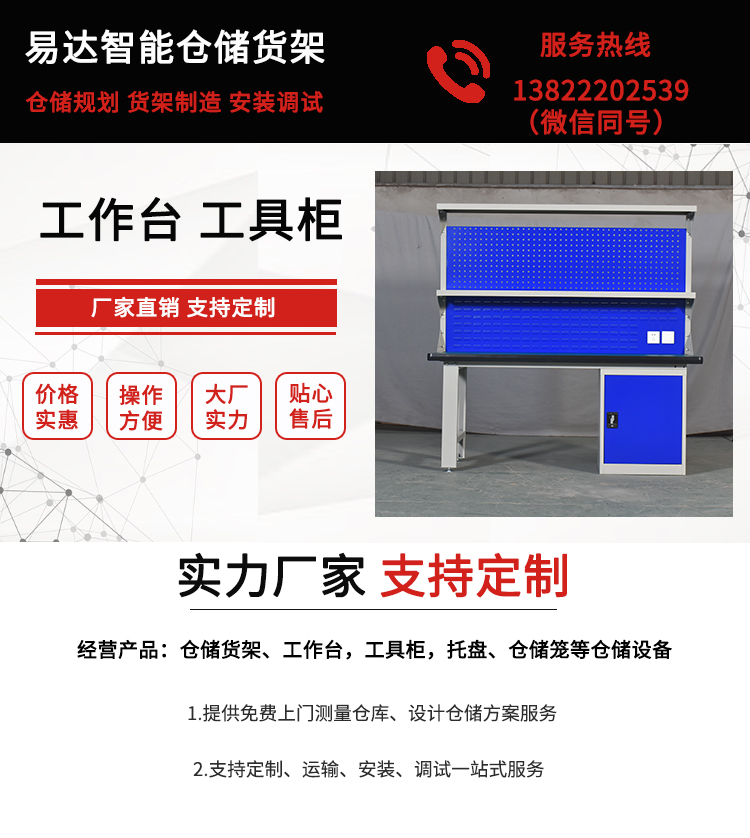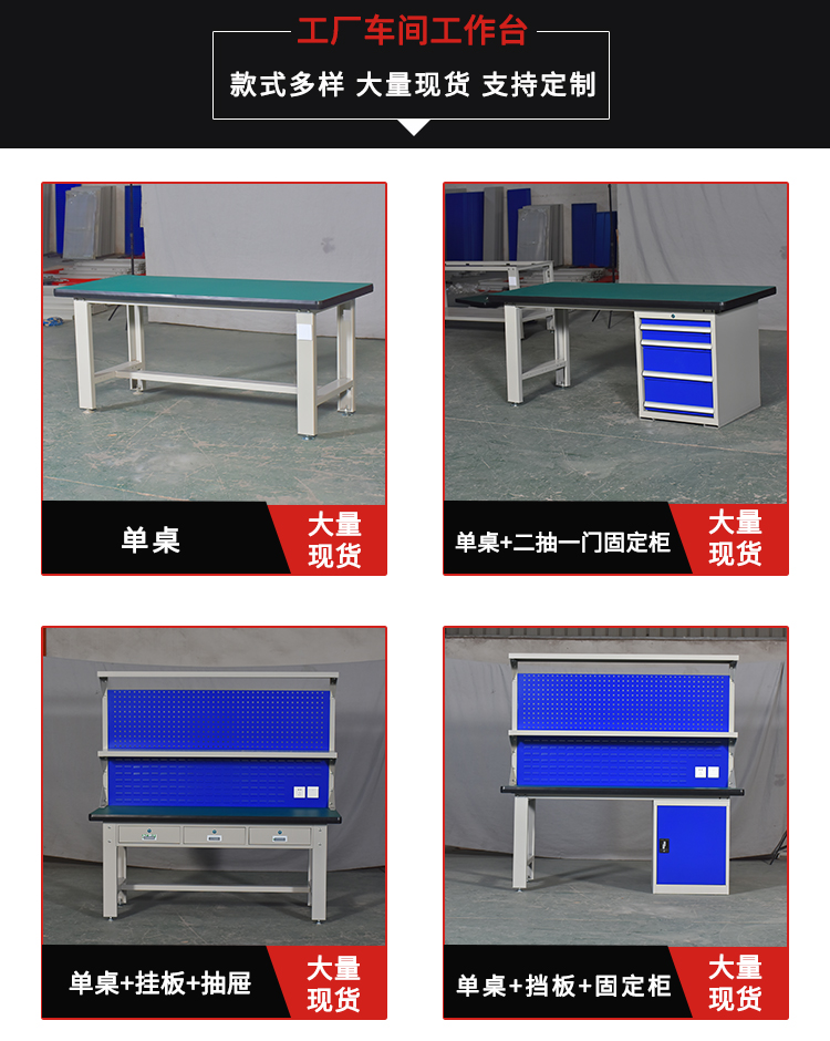 工作臺(tái)也叫工作桌、操作臺(tái)、車間工作臺(tái)、防靜電工作臺(tái)、耐磨桌、工廠車間重型維修鉗工作臺(tái)、鉗工臺(tái)、工作維修臺(tái)、抽屜式工作臺(tái)、帶掛板工作臺(tái)、維修工作柜、置物柜、工具柜、工具車、抽屜工具柜等,可協(xié)助貨物的存儲(chǔ)、揀選、打包、輸送等,功能強(qiáng)大,作業(yè)靈活。
